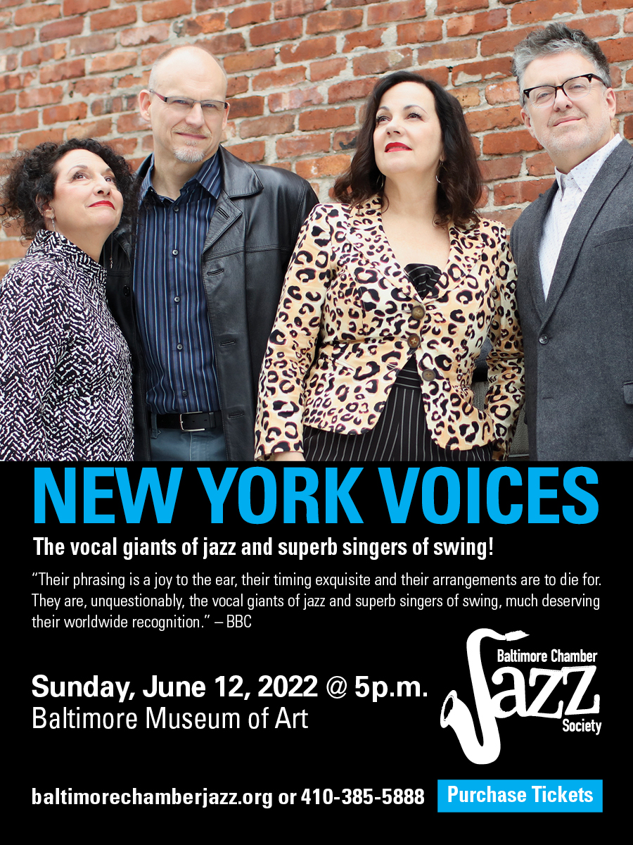 The Baltimore Chamber Jazz Society (BCJS) will present its inaugural vocal ensemble performance as part of its 30th anniversary celebration. Grammy Award winners, New York Voices (NYV) will take the stage, making their Baltimore debut.
