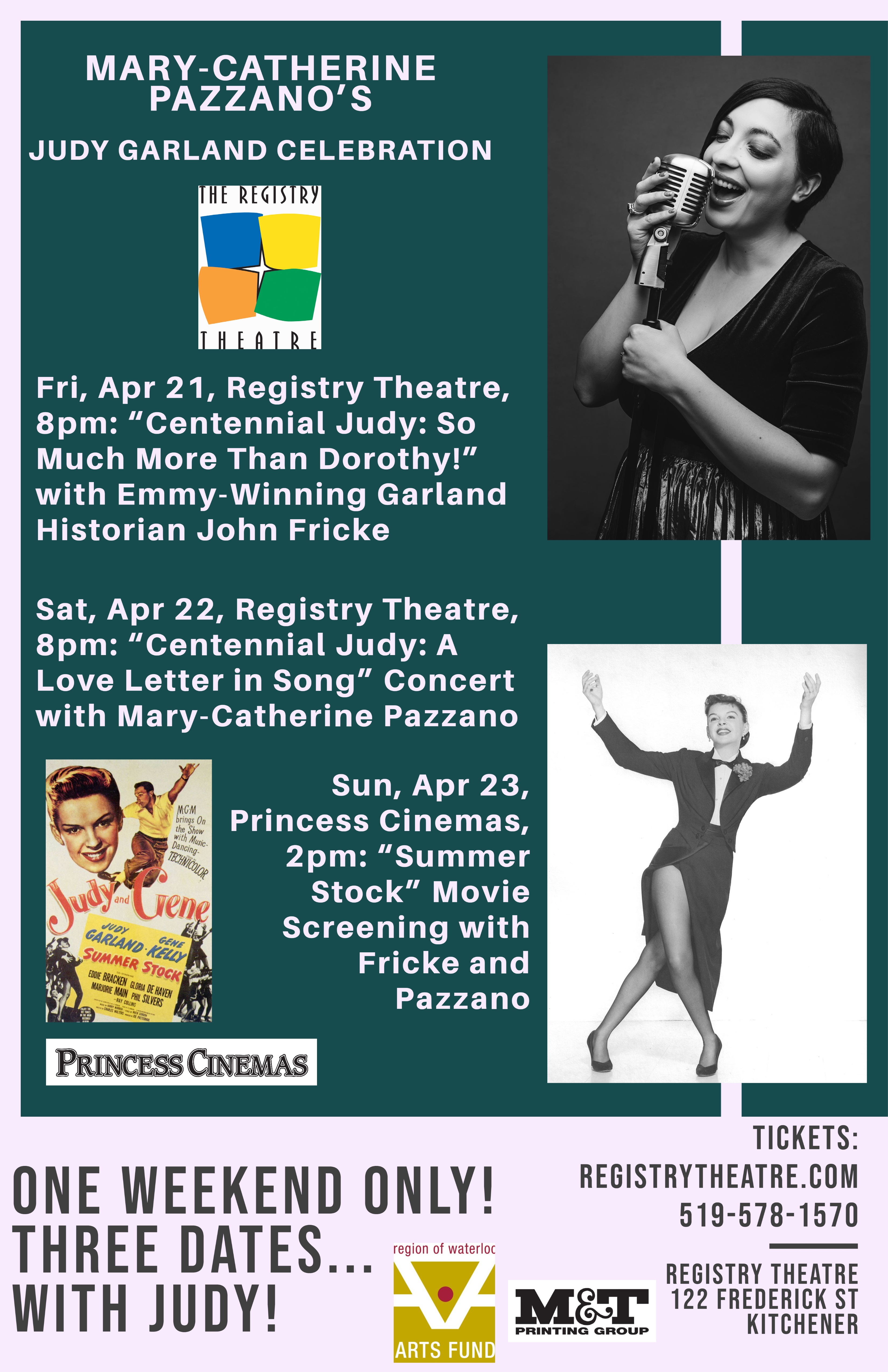 Join Mary-Catherine for a two-act, jazzy tribute to Judy in song. The first act will lovingly reflect the songbook of Garland’s prolific MGM film career– hear Garland faves such as “The Trolley Song”, “Get Happy”, “The Boy Next Door”, “On the Atchison Topeka and the Santa Fe”, as well as lesser-known gems/Pazzano’s personal faves from the Garland film canon. The second act will go beyond MGM and shine the spotlight on Garland’s post-film concert career. Hear gems like “Zing! Went the Strings of My Heart”, “The Man That Got Away”, “Almost Like Being in Love/This Can’t Be Love”, and much more! Mary-Catherine will put her own jazz spin on the Judy songbook, while resurrecting some of Garland’s most-loved arrangements. ...