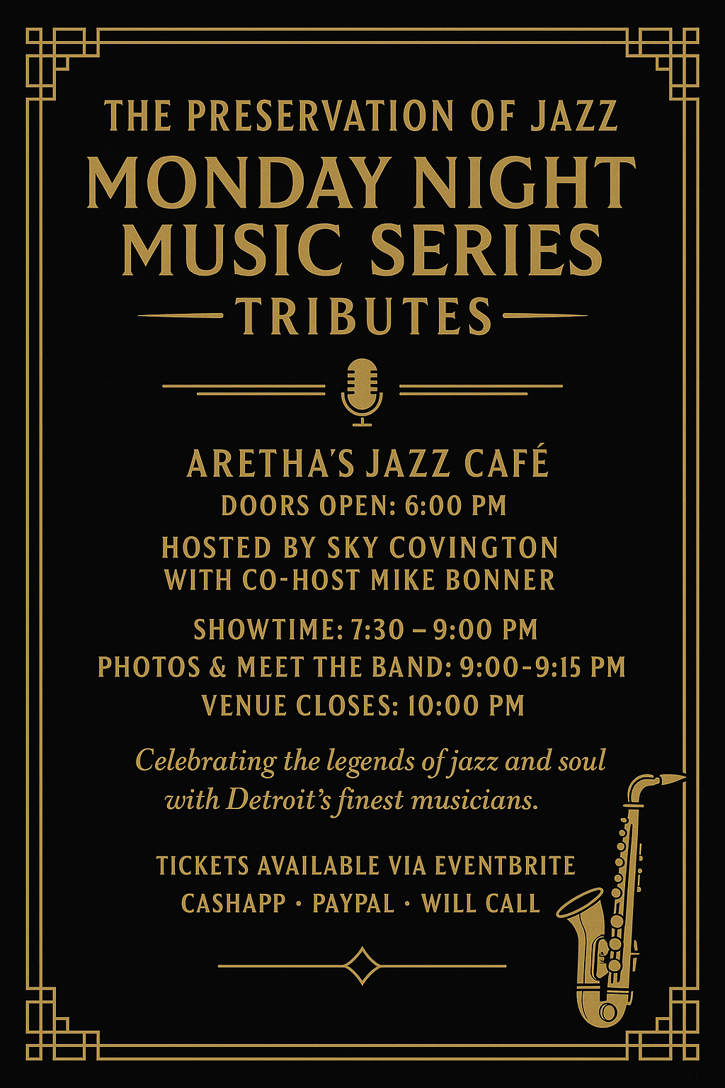 Detroit, MI β The Preservation of Jazz proudly presents its Fall & Winter 2025 Monday Night Music Series Tributes at the legendary Arethaβs Jazz CafΓ©. While most concerts fall on Mondays, select shows will take place on Wednesdays and Thursdays β all remaining part of this historic series.