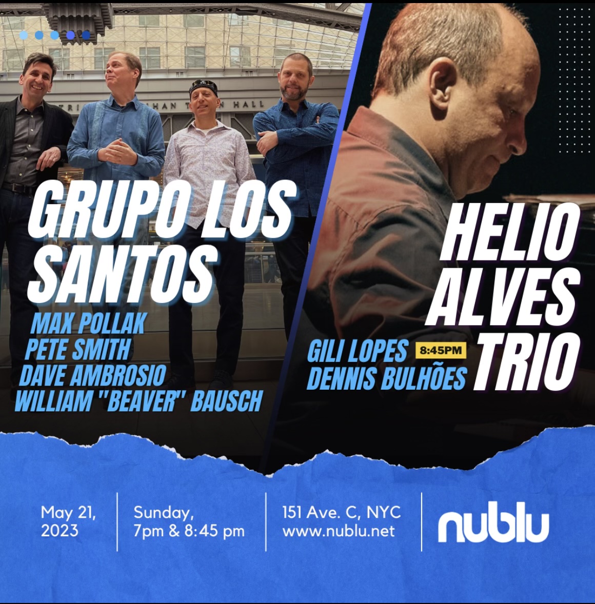 Grupo los Santos - Helio Alves Trio double-bill at Nublu, Sunday May 21. GLS @ 7pm, Helio Alves @ 8:45. One cover charge. Two fantastic bands.