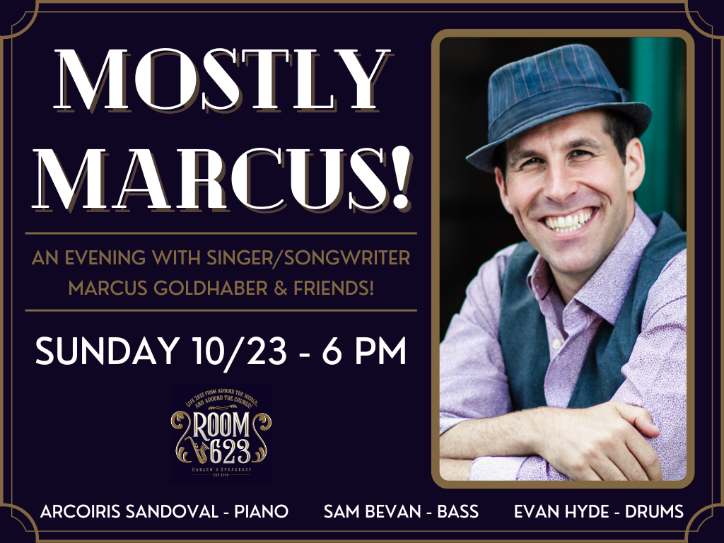 Acclaimed singer, songwriter, host & emcee, Marcus Goldhaber brings his popular weekly series, “Mostly Marcus!” to Room 623! With his signature phrasing and intimate interpretation, Goldhaber will sing from the Great American Songbook and feature his like-minded catalog of original songs! An exciting line-up of surprise guest vocalists will also combine for an evening of playful spontaneity, improvisation and duets! Come see why Will Friedwald (Jazz critic for The Wall Street Journal) claims “[Marcus has] the perfect voice (w/mimosas & eggs!)”