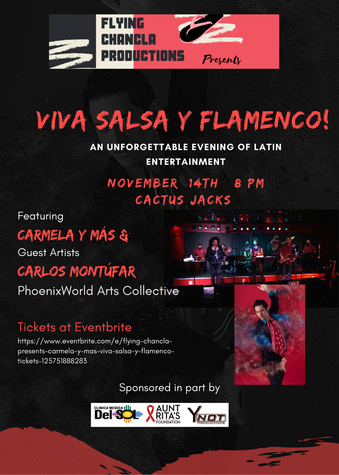 Join Carmela and her electrifying Latin Salsa band as they welcome guest artists Carlos Montúfar and his Phoenix World Arts Collective. This show features not only the hot smoking sounds of Latin Salsa, but it also brings alive the incredible dance artform of Flamenco, performed by the amazing Carlos Montúfar and his ensemble. Flying Chancla is proud to continually bring you the finest in Latin Entertainment!