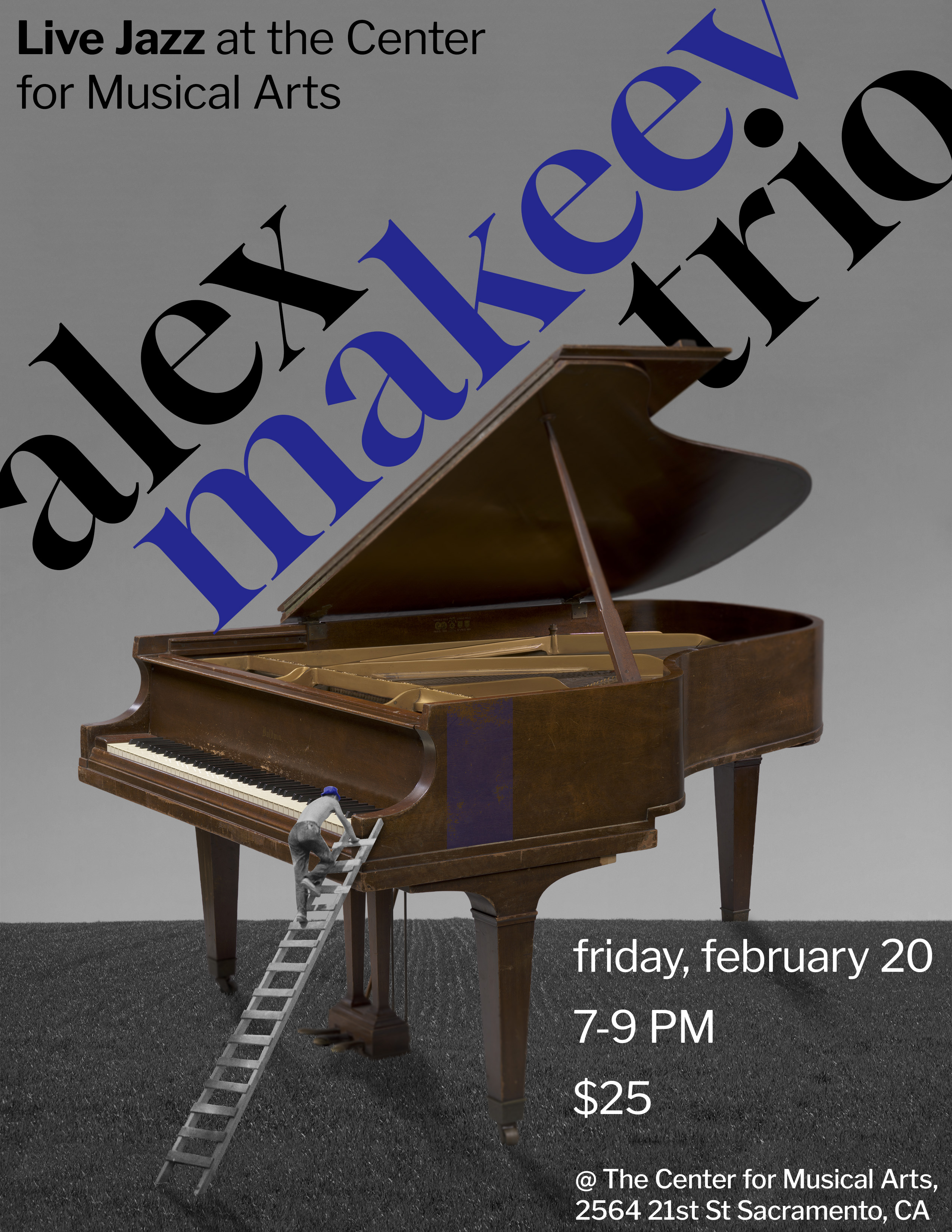 Led by the titular Alex Makeev, an award winning pianist from premiere outlets such as Downbeat, the Alex Makeev Trio enlists Arlo Jones on bass and Sebastian Najbjerg on drums. The trio is a genre spanning modern jazz trio that blends elements from across all of music to create something truly modern. Consistent performers all around Sacramento, this trio has played venues from Twin Lotus Thai to the Torch Club. The group engages all ages to the world of jazz and helps inspire new generations with excellent improvisation and stunning arrangements. Together they'll create an experience that should not be missed. ...