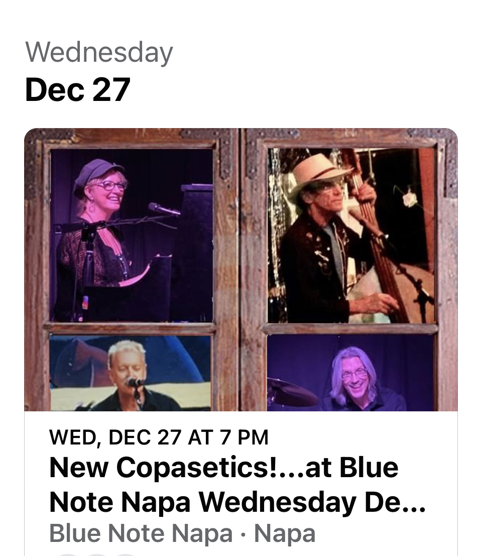 New Copasetics!...at Blue Note Napa Wednesday Dec 27, 7:00 pm ...with Dallis Craft, Tim Eschliman, Gary Potterton and Kevin Hayes! We'll be performing Originals and hand-picked Roots Rock, Americana, & Soulful tunes... Locals Night at the Blue Note! Napa Co residents can get in free! For others, prices start at only $5