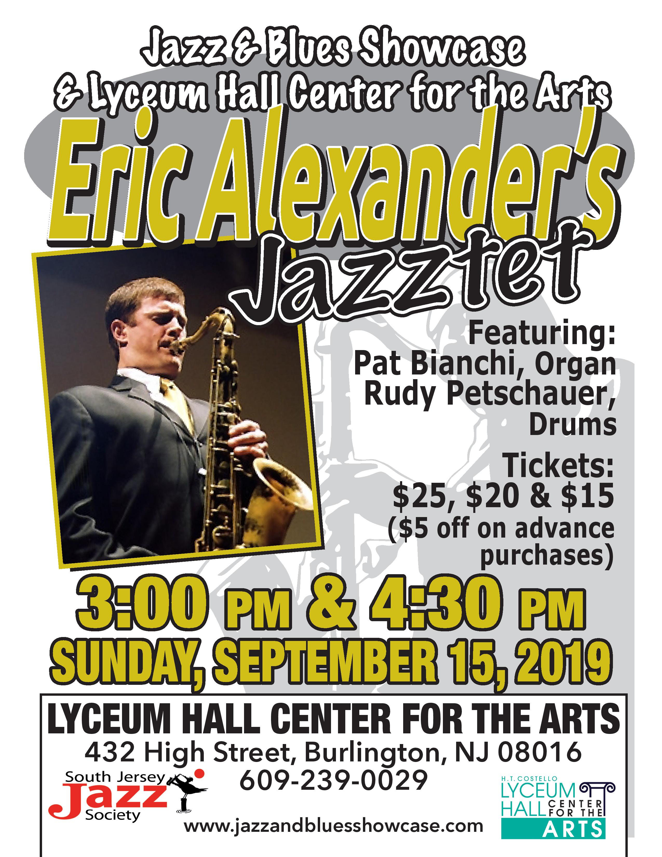 Internationally renowned, award-winning tenor saxophonist ERIC ALEXANDER headlines the first of three shows in this fall's monthly jazz series at the Lyceum Hall Center for the Arts in Burlington, NJ. Support in Alexander's ensemble is from celebrated jazz artists PAT BIANCHI, organ, and drummer RUDY PETSCHAUER.